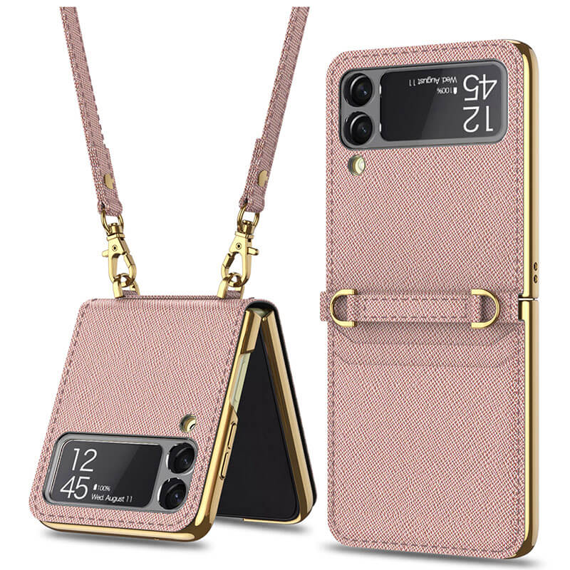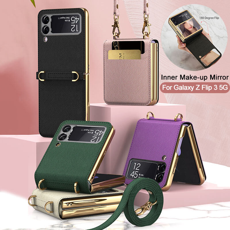 Textured Leather Strap Magnetic Fold Mirror Case For Samsung Galaxy Z Flip 3 5G